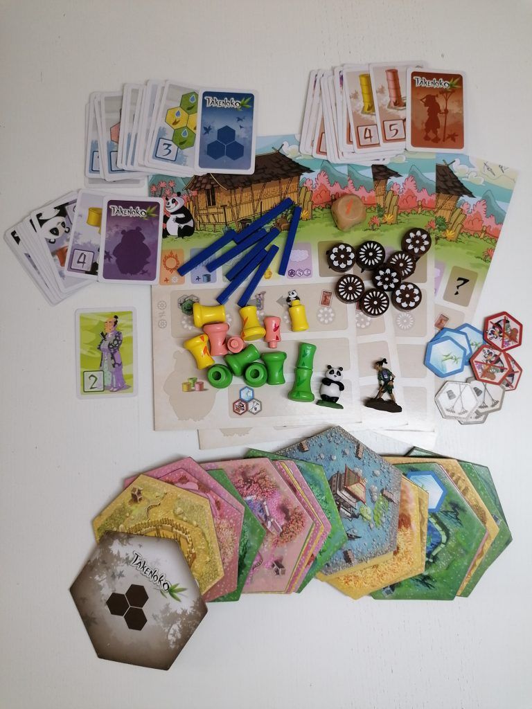 Come dargli torto? Takenoko ha tanti componenti bellissimi: ci sono le tessere esagonali del terreno, divise in tre tipologie diverse riconoscibili dal colore, giallo, verde e rosa; c’è il bambù che è fatto di legno molto resistente e ben colorato, ci sono le carte obiettivo divise in tre tipologie: panda, giardiniere e terreno, ci sono poi le tesserine, anch’esse esagonali, che rappresentano: fertilizzante, acqua e recinzione, poi ci sono i canali d’acqua di plastica blu e il dado meteo, anch’esso di legno; infine i segnalini azione in legno, decorati in maniera diversa per ogni giocatore, oltre alle 4 plancette giocatore.