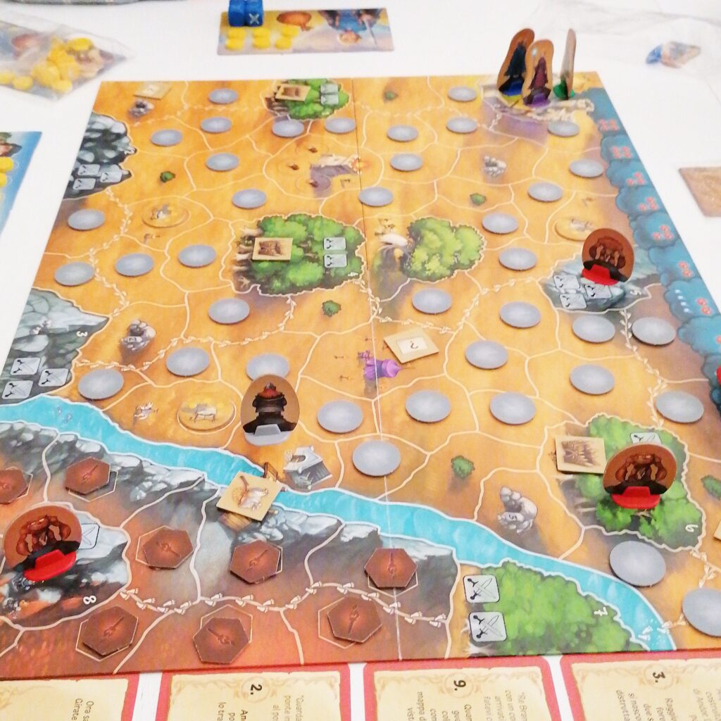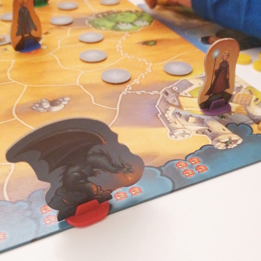 Sul tabellone ci saranno delle tessere-ombra che andremo a scoprire, ogni volta che finiremo il nostro movimento su quella casella: potranno darci soldi, legna, oggetti utili nel combattimento… oppure, faranno entrare in gioco nuovi mostri! Tommaso punta a girare tutte le tessere, sperando di trovare qualche mostro da combattere. Ogni personaggio ha un certo numero di gettoni-energia e, quando li avrà esauriti tutti, dovrà andare a dormire; per quel turno, non potrà fare più nulla. Quando tutti i giocatori sono andati a dormire, si determina la fine del giorno, in attesa del nuovo sole. Peccato però che la notte favorisca i mostri ed il drago…