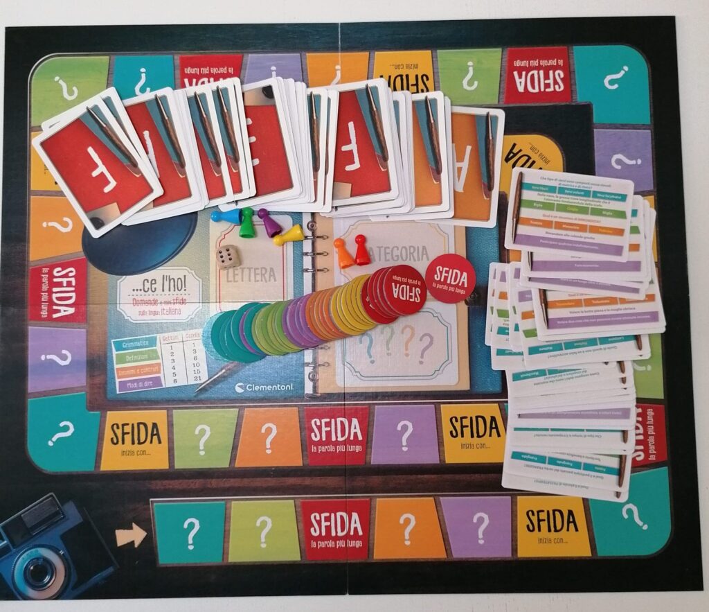 Il tabellone è ben fatto: abbastanza robusto, mostra un percorso di caselle colorate alle quali è associata una domanda o una sfida. Nel primo caso, il giocatore di turno dovrà rispondere a quesiti relativi a regole grammaticali, definizioni, sinonimi e contrari, proverbi e modi di dire. Trattandosi di quesiti a risposta multipla, potranno lanciarsi a rispondere anche bambini delle classi iniziali, ancora indietro con gli studi di grammatica.