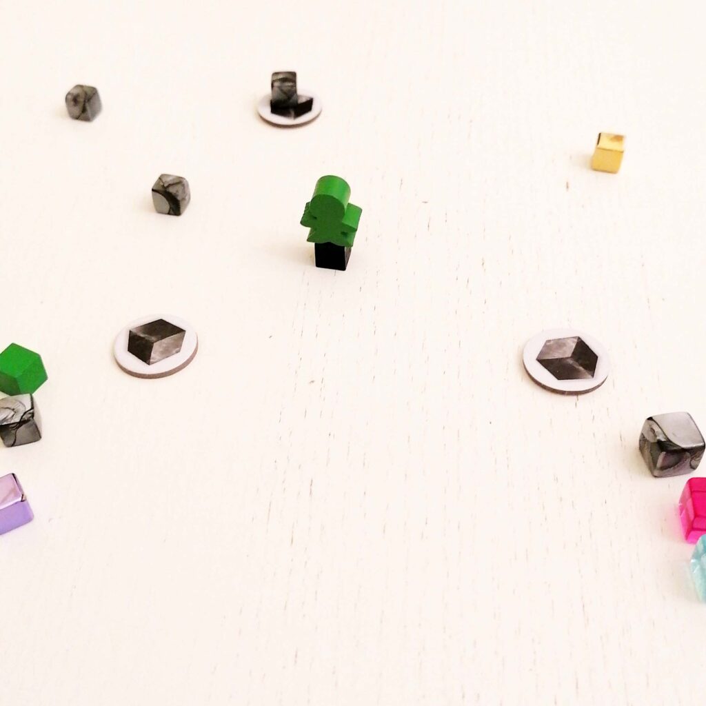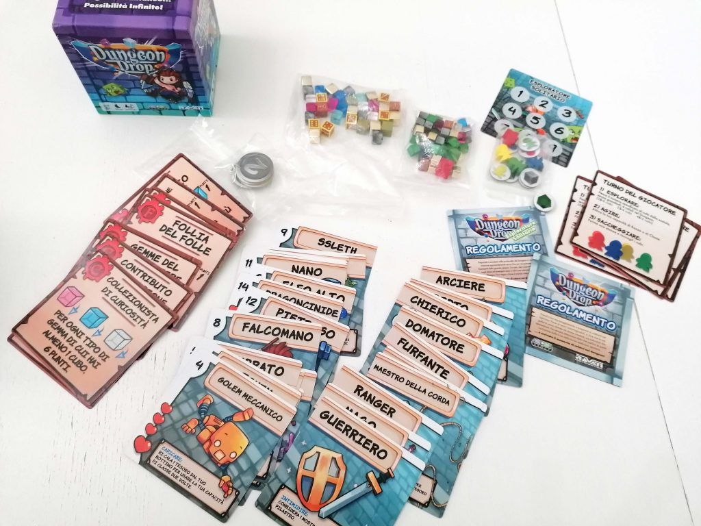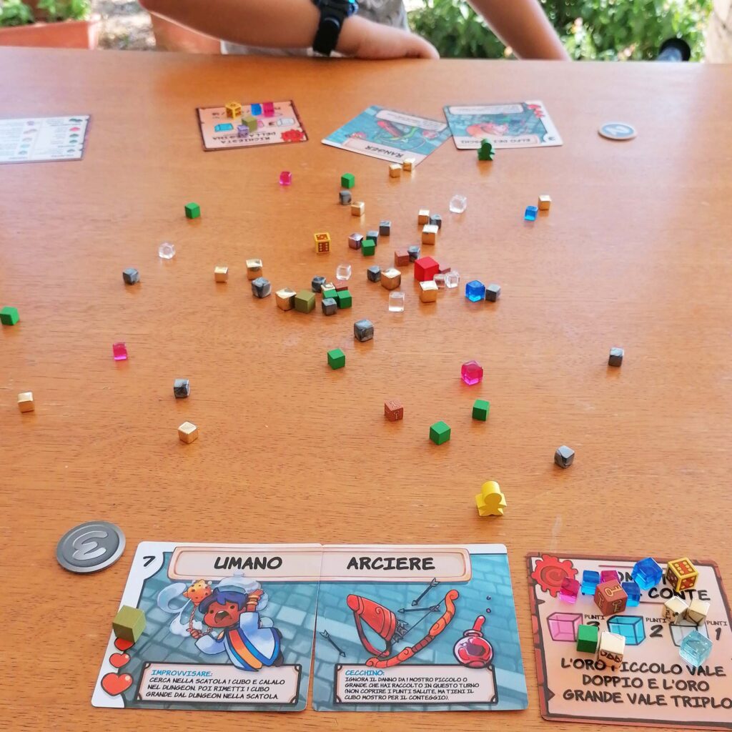 Infine, i famigerati cubetti, di 12 tipologie differenti, caratterizzate per colore, materiale e dimensioni. Ad esempio, i cubetti verdi rappresentano mostri (di valore diverso a seconda della dimensione…in realtà quello più cattivo è il drago, ed è il cubo più grande in assoluto di colore rosso), quelli argentati i Pilastri del Dungeon, quelli di plastica trasparente tre tipi di gemme preziose, e così via.