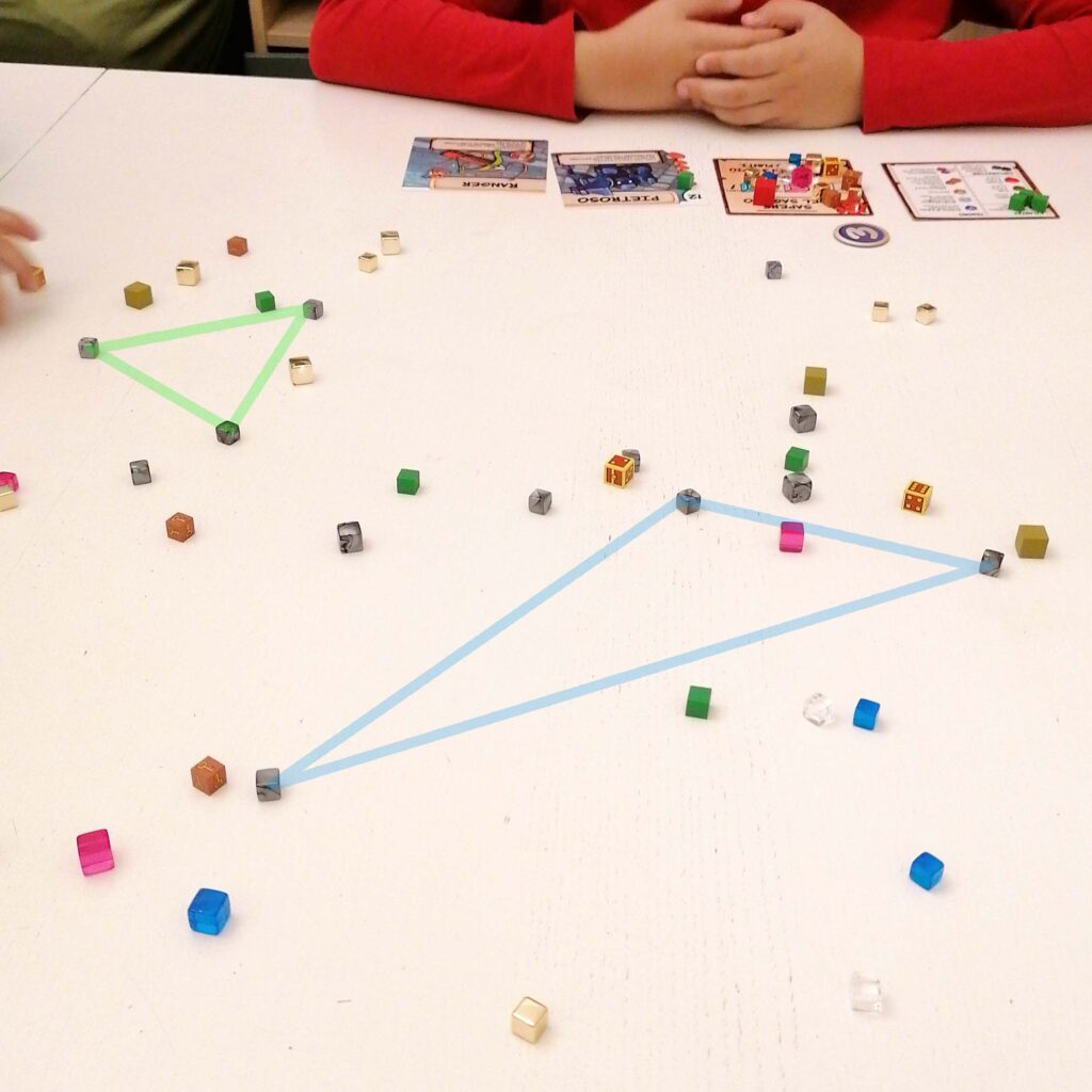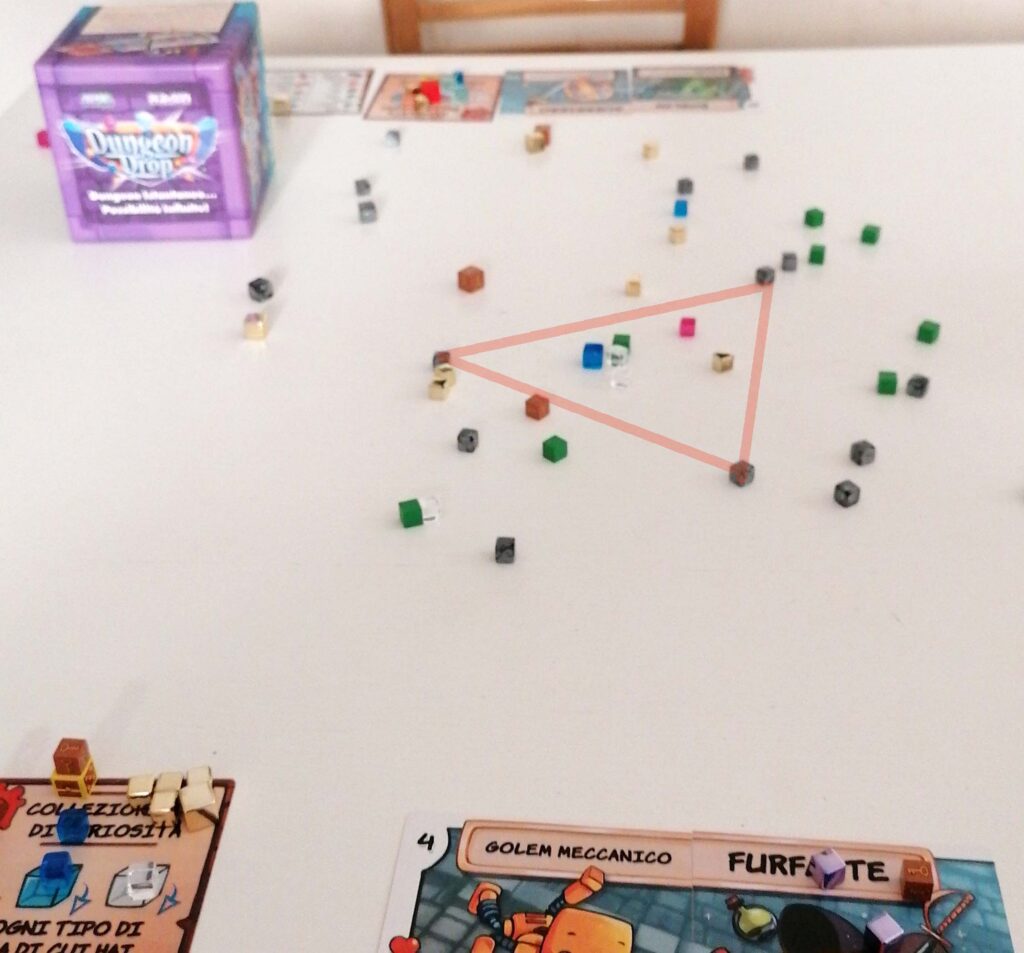 Dungeon Drop può essere uno stimolo interessante per sviluppare la capacità di visualizzazione geometrica, e di immaginazione tridimensionale: per fare una stanza occorrerà visualizzare sul tavolo il triangolo più performante in quel momento (il dungeon è in evoluzione continua…ricordate il nuovo lancio ad ogni inizio turno?) e questo è un ottimo esercizio visivo. Al tempo stesso, trattandosi di un gioco così fortemente astratto, il bambino dovrà immaginarsi l’avventura, la stanza, il mostro, e così via…Insomma, la geometria diventa favola nel gioco.