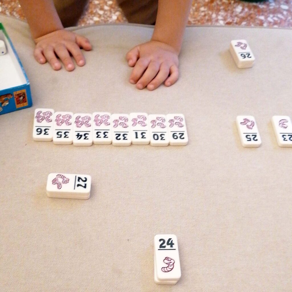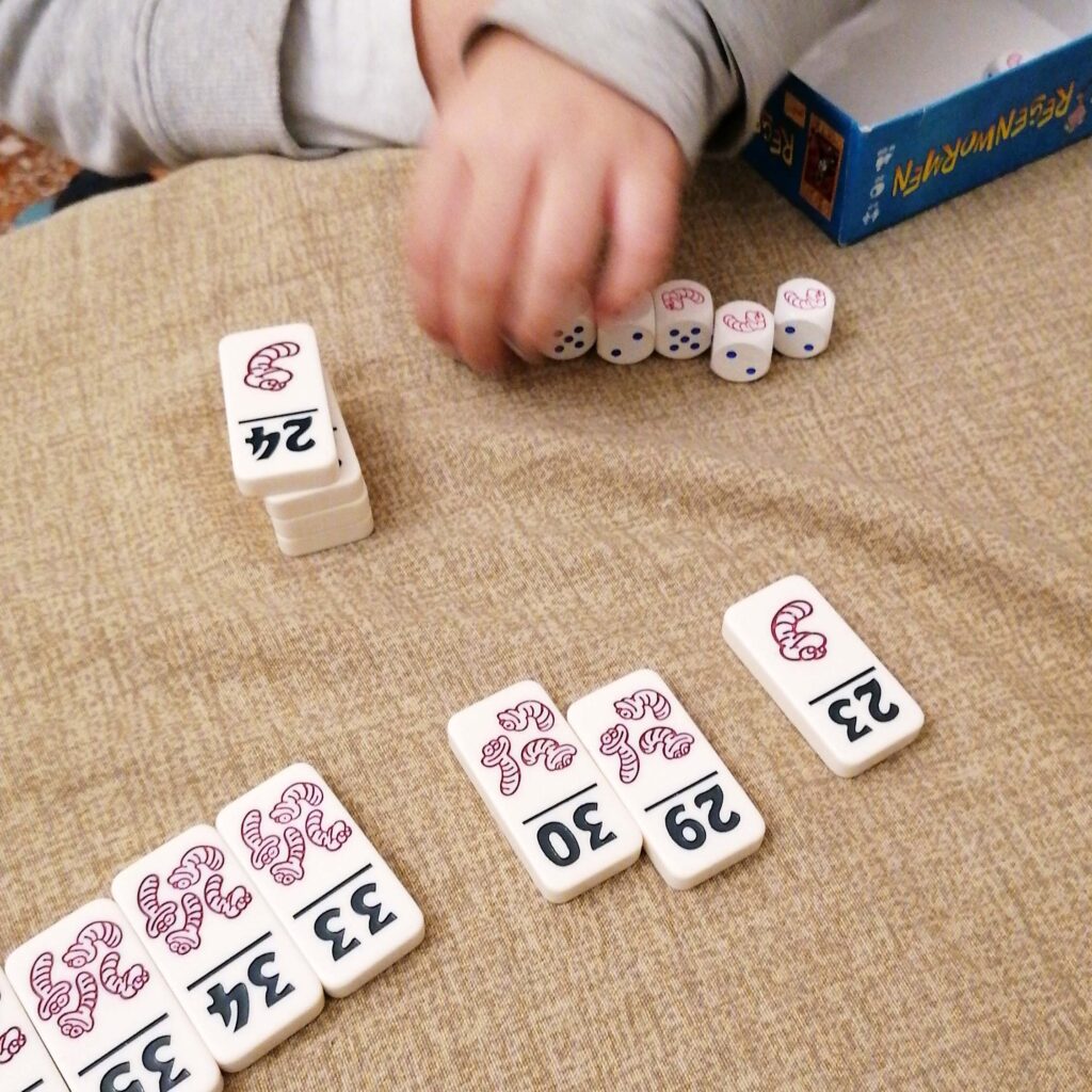 Il verme è tratto esige una certa capacità di calcolo strategico. E’ fondamentale capire quando fermarsi o rilanciare, per non sballare e perdere così tessere preziose; si punta tutto sulla eventualità statistica che escano i numeri che mancano. Naturalmente però la fortuna sarà determinante: se siete come Tommaso e Francesco, potreste ottenere 4 vermi con un solo tiro (da prendere ad occhi chiusi); se siete fortunati come me, sballerete con 2 tiri di dadi. Il gioco finisce quando viene presa l’ultima tessera disponibile e vincerà il giocatore che ha catturato il maggior numero totale di vermi.
