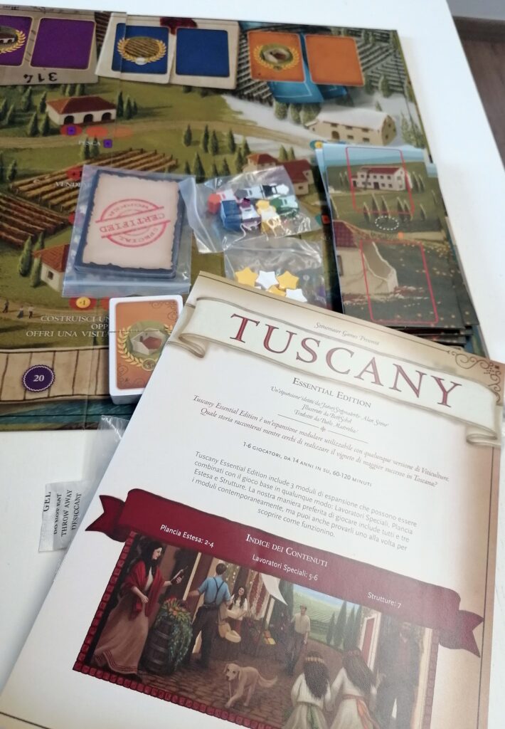 Poi, per farla breve, dopo 4 anni (nel corso dei quali ho giocato Viticulture Essential Edition con un piacere immenso), continuando a leggere commenti di giocatori che sostenevano che, per carità, carino Viticulture Essential Edition, ma senza il Tuscany Essential, sembrava mi stessi perdendo chissà cosa…così me lo sono fatta regalare!