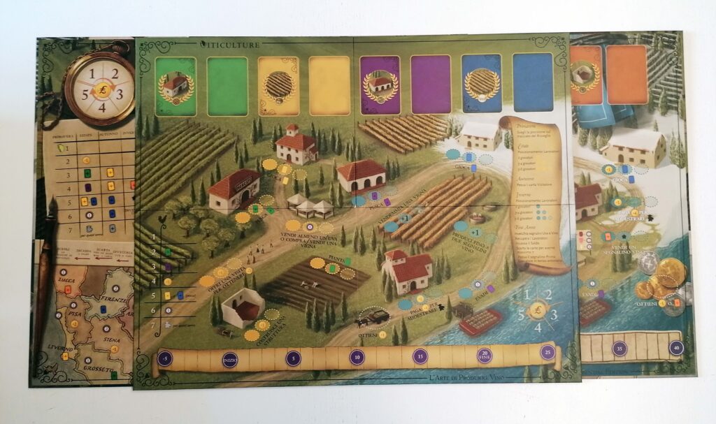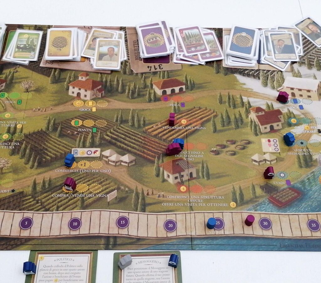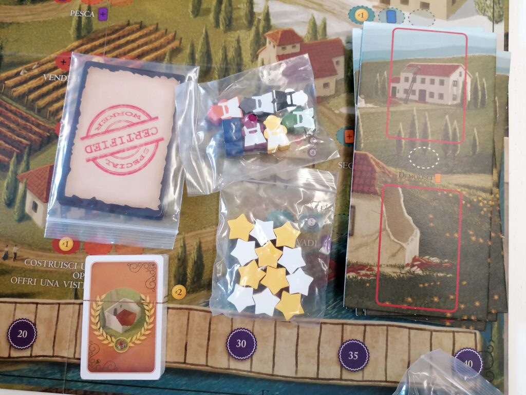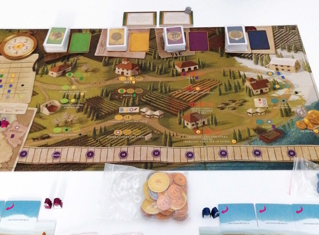Il set up generale invece è dato dal tabellone, bellissimo, che rappresenta le colline Toscane, sul quale troveremo spazi (gialli dedicati alle operazioni estive, e blu a quelle invernali), dove potremo posizionare i nostri lavoratori durante il gioco; troveremo poi la barra punteggio, il calendario della sveglia mattutina, e l’alloggiamento dei 4 mazzi di carte piccole (e deliziose) che si dividono in: vitigni, contratti, visitatori estivi e invernali.