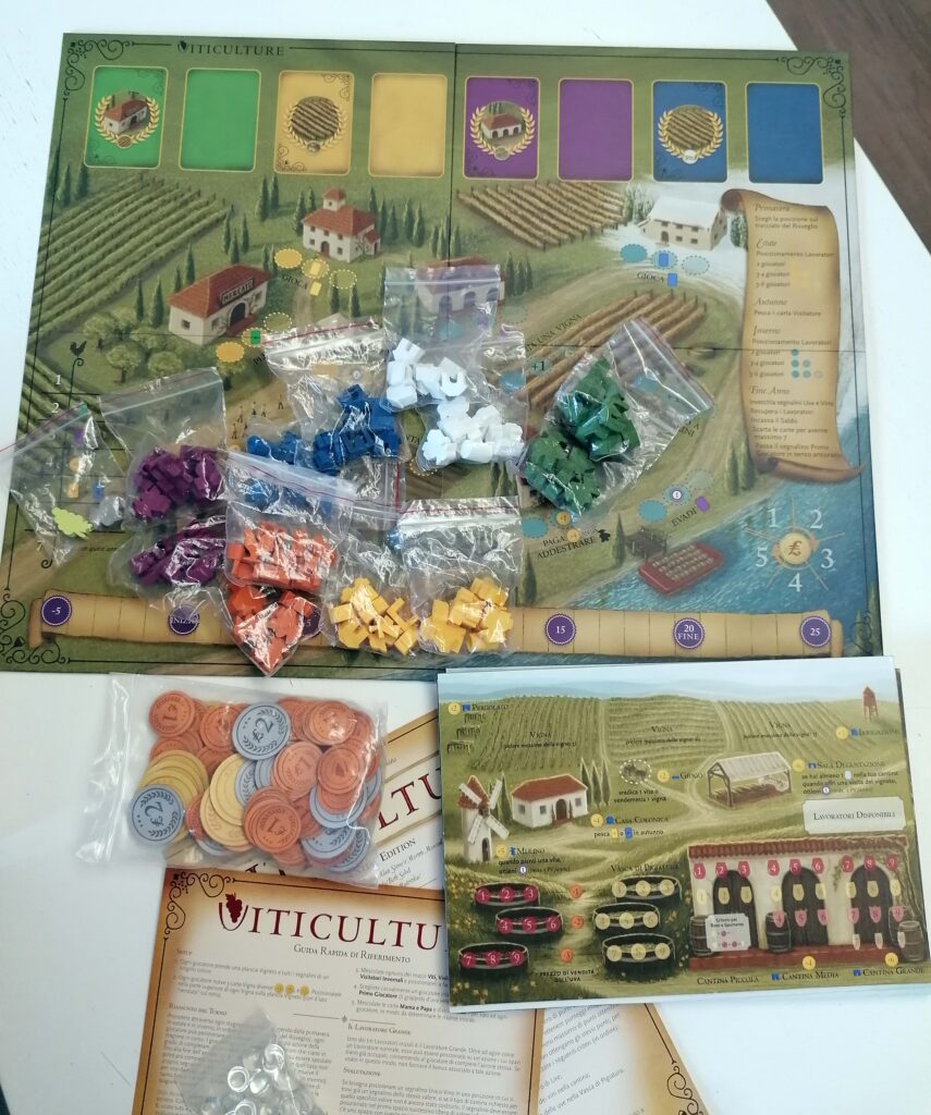 Il motivo per cui ho chiesto come regalo di compleanno Viticulture è stato per le recensioni fantastiche che ha! Pensavate fosse per i suoi materiali vero?? Vabbè ci ho provato, il vero motivo sono stati proprio i materiali, anzi in particolare le “gocce” di vino; le recensioni entusiaste sono invece servite a convincere Paolo che fosse un regalo da farmi!