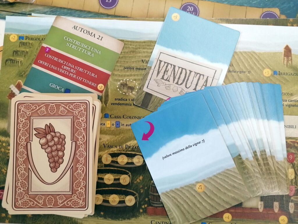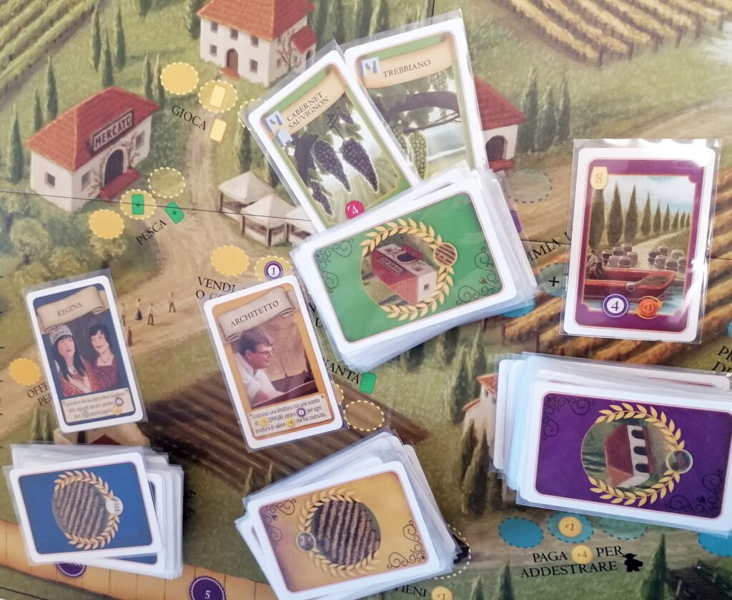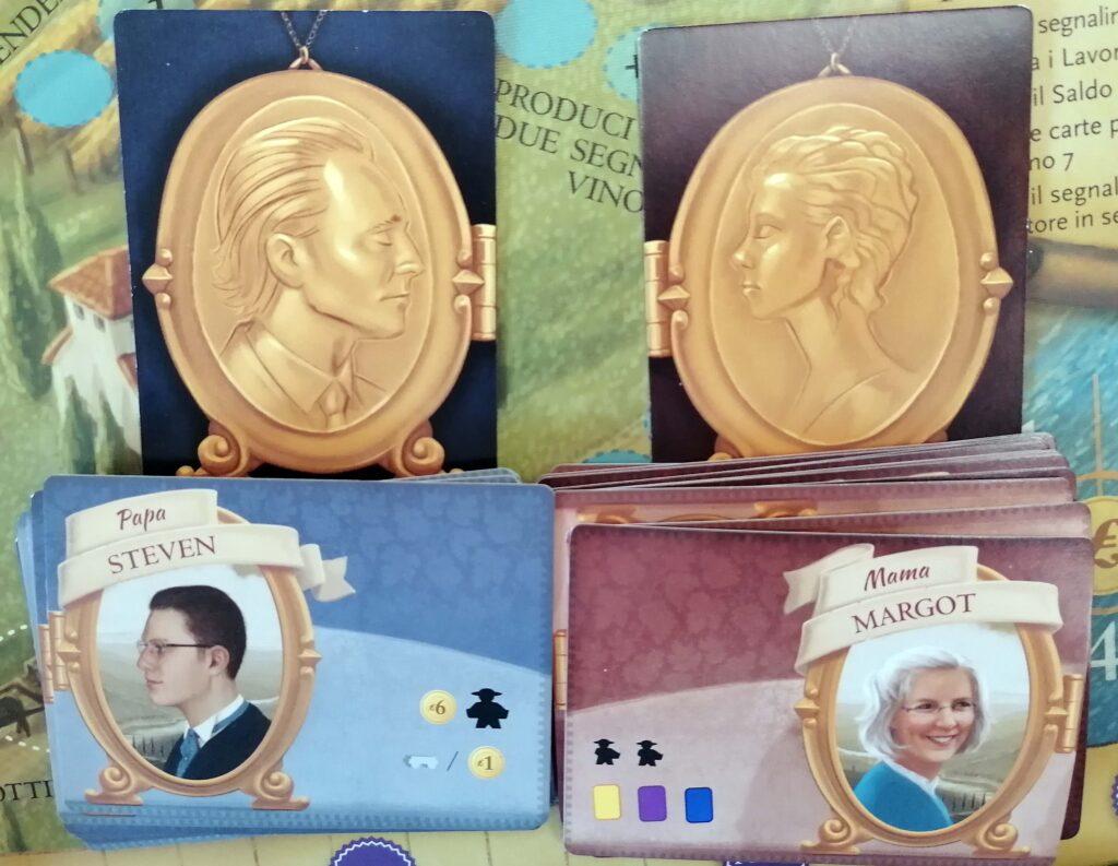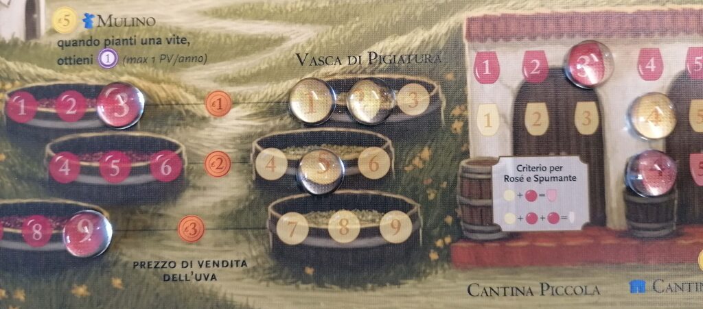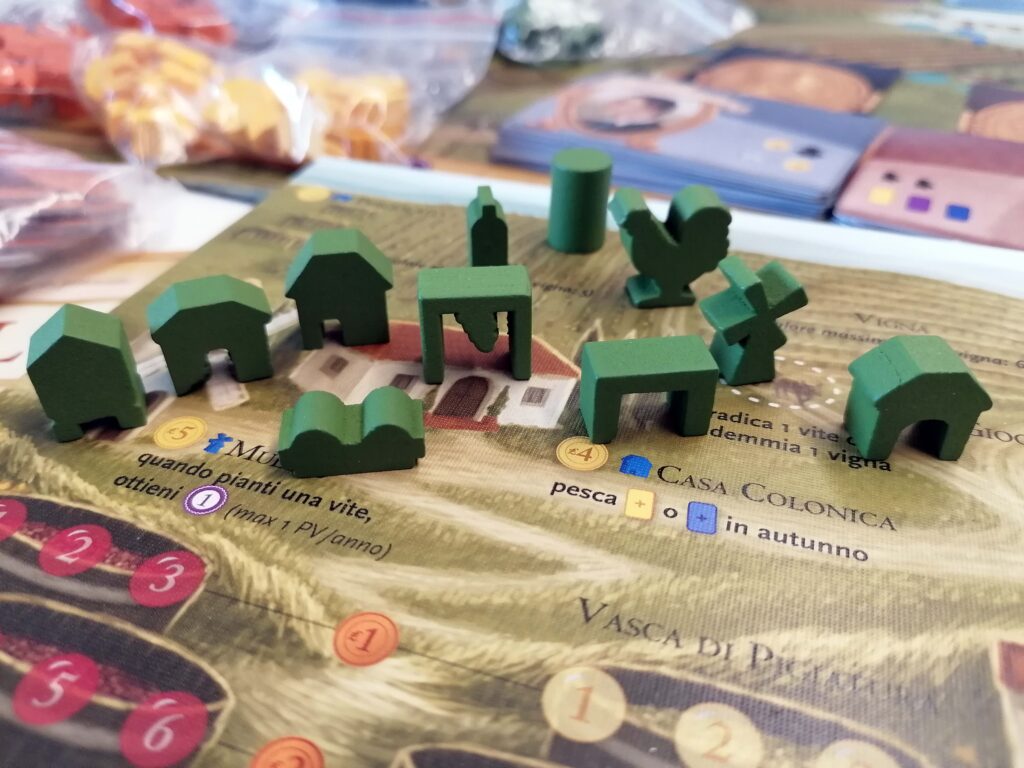 Ogni giocatore prenderà la sua plancia personale, dove troverà: una cantina, vasche di pigiatura per uva bianca e uva rossa, 3 vigneti (su cui si pianteranno carte vigna) e vari spazi dove collocare i bellissimi edifici in legno che costruiremo durante il gioco; naturalmente ogni edificio costruito ci permetterà di fare qualcosa in maniera migliore. Ogni giocatore pescherà una carta-mamma ed una carta-papà che determineranno le condizioni economiche e di manovalanza di partenza (le nostre vigne saranno frutto di una eredità) e che saranno differenti per ogni uno. All’inizio della partita si hanno tre lavoratori, ma se ne possono aggiungere altri nel corso del gioco. Nella dotazione iniziale avremo sempre un lavoratore “grande”, che può eseguire azioni anche in spazi già occupati. Lo amerete.