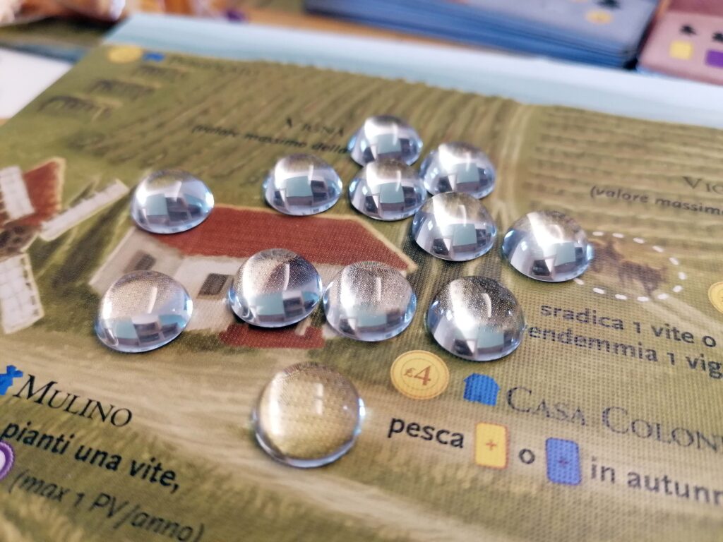 Io ero affascinata dai materiali pazzeschi, che comprendono casette e omini di legno dai colori pastello, e lasciatemi dire che i colori usati da Viticulture Essential Edition ad oggi sono i più belli che abbia mai trovato in un gioco… poi ci sono queste “gocce” di vetro, siiiii vetrooooo, trasparente che andranno posizionate sulle plance nel momento in cui andremo a produrre il vino, e che sono favolose alla vista ed al tatto… oddio, quando si deve rimettere a posto il gioco e bisogna individuarle sul tavolo, virano verso il “belle ma impossibili da prendere!”. Per me era già un si, solo a vedere il materiale messo sul tavolo la prima volta, poi lo abbiamo anche giocato… Ho scoperto di amare i gestionali giocando a questo gioco, che richiede strategie a lungo termine per vincere, cosa che ad oggi non sono ancora riuscita a fare: ai gestionali vince sempre Paolo, nonostante dica che non sono nelle sue corde; i fatti lo smentiscono chiaramente!
