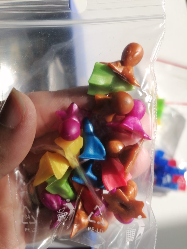 Galaxy Trucker ha moltissimo materiale in cartone resistente, con grafiche chiare e vivaci. Ci sono anche una serie di materiali in plastica come i cubi traslucidi che indicano le casse oppure i bellissimi mini astronauti bianchi, veramente stupendi come stupende sono le batterie che sembrano piccole tic tac, i razzi e gli alieni. Infine abbiamo una clessidra, 2 dadi e 3 mazzi di carte con disegni curati e icone chiarissime. I miei figli hanno iniziato a ridere leggendo ciò che è scritto sulla scatola, perché effettivamente è un gioco che si basa su premesse umoristiche e tutto il regolamento ha diverse affermazioni divertenti all’interno, questo aiuta ad entrare nel gioco con il giusto spirito!