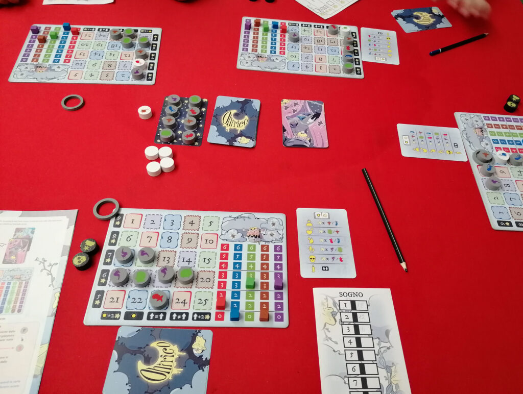 Per il resto Onirico è simpatico: una specie di “tombola” alternativa che integra meccanismi di scommessa e meccaniche in stile Azul. Da questo punto di vista un gioco non banale, con una forte componente di alea, ma che richiede anche notevoli capacità di calcolo e di pianificazione strategica nella formulazione delle puntate. C’è da dire inoltre che i Sandman Jolly e i gettoni Sogno intenso, innescano interessanti effetti combo nella moltiplicazione dei punteggi. Il gioco è piuttosto equilibrato poiché per collocare i gettoni dove vogliamo tenderemo a puntare al ribasso, ma in questa maniera ci priveremo della possibilità di piazzare un maggior numero di gettoni: insomma una interazione ben equilibrata. In generale sarà decisivo massimizzare l’effetto dei moltiplicatori, e la difficoltà del gioco sta proprio nel fatto che questo fattore potrebbe passare in secondo piano durante i turni di gioco, nei quali la nostra attenzione rischierà di concentrarsi piuttosto sull’esigenza immediata di posizionare i gettoni al meglio possibile. Soprattutto nella prima partita di Onirico sarà bene chiarire ai giocatori tutto il flusso di gioco, perché la pianificazione di lungo termine è fondamentale