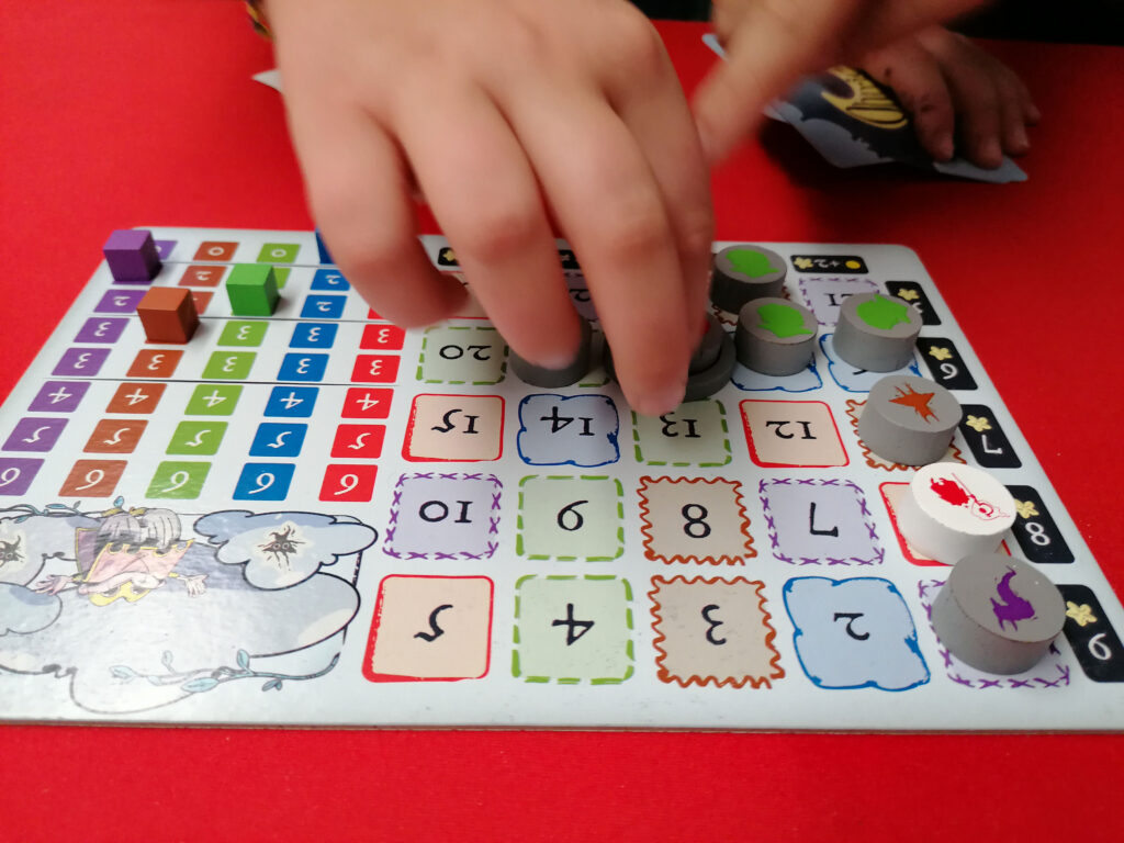 3. Avanzamento sul tracciato: quando tutti avranno effettuato la propria puntata, posizioneranno il proprio anello sulla plancia, nello spazio corrispondente al numero scelto (inizialmente l’anello giallo viene attribuito in maniera causale). Contestualmente avanzeranno di una posizione il proprio cubetto sul tracciato del colore corrispondente a quello della casella individuata attraverso la puntata.