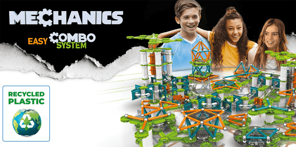 Da oggi la linea Geomag Mechanics diventa più green e innovativa: tutti gli elementi di costruzione non trasparenti sono stati riprogettati per essere prodotti con plastiche riciclate, inoltre si sta continuando a sperimentare per ottenere un prodotto con plastiche riciclate al 100%
