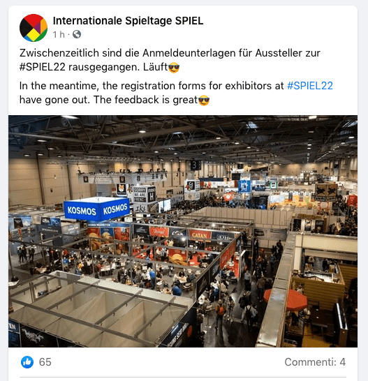 La Internationale Spieltage SPIEL di Essen, più comunemente conosciuta come Fiera del Gioco di Essen, con un post sui Facebook ha segnalato che sono aperte le registrazioni per gli espositori per l’edizione 2022 ed a quanto riportato anche con un ottimo feedback da parte degli espositori.