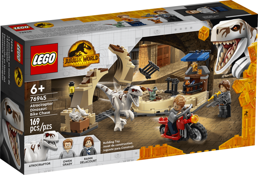 Descrizione: Preparati per un gioco ricco di azione con questo fantastico set, ispirato al film in uscita Jurassic World Dominion . Ha un mercato con un muro per il feroce Atrociraptor e una fantastica motocicletta da sfondare, una fossa di battaglia per 2 piccoli dinosauri, più le minifigure di Owen Grady e Rainn Delacourt.