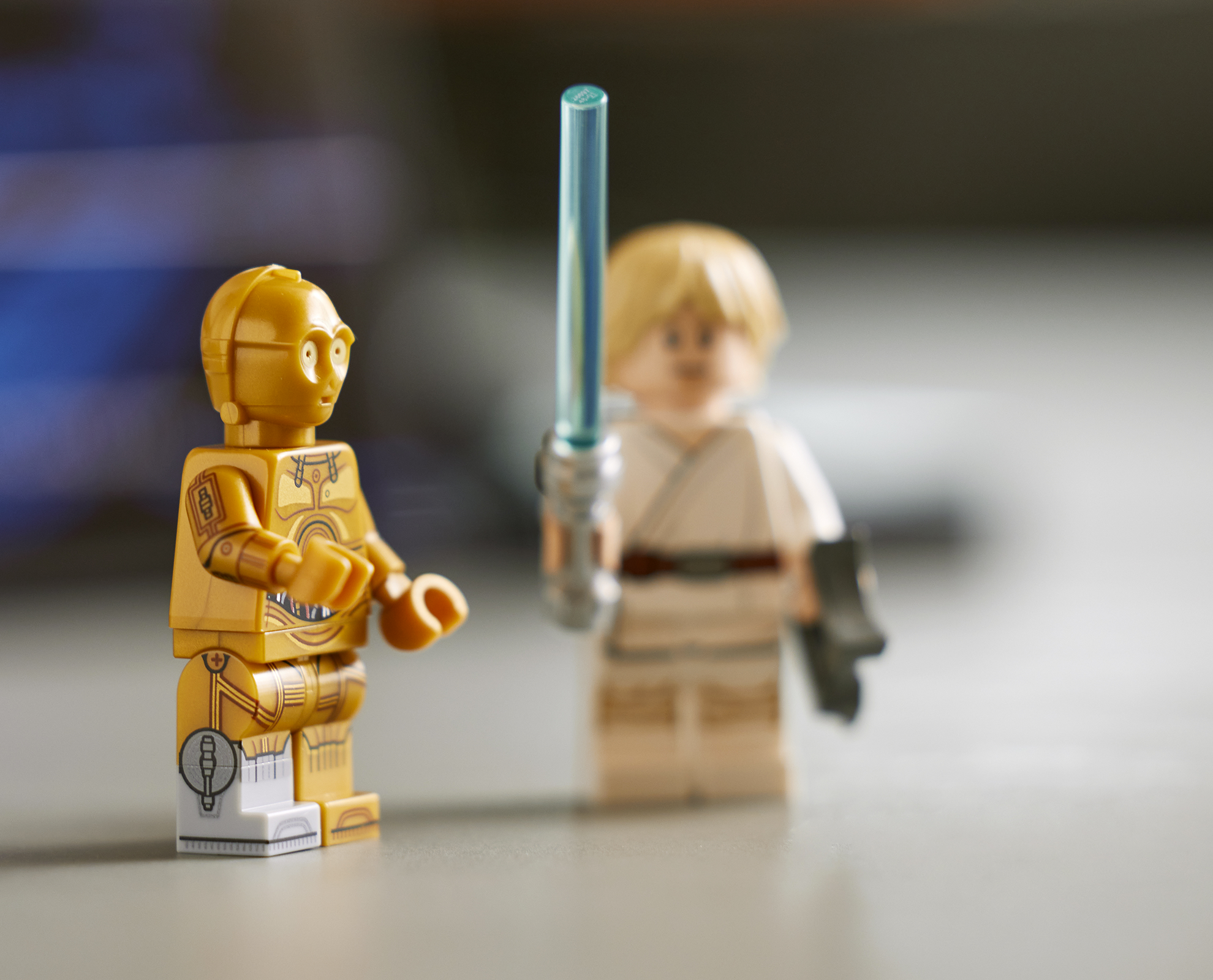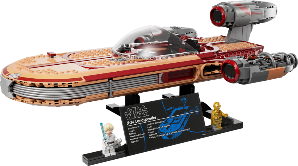 Il set LEGO Star Wars Luke Skywalker Landspeeder è lungo 49 centimetri e comprende la cabina di pilotaggio a due posti, il motore a turbina senza copertura, l’iconico parabrezza curvo della cabina di pilotaggio più un’esclusiva minifigure C-3PO (con gambe modellate 2K e un stampa laterale) e la minifigure di Luke completa di spada laser.