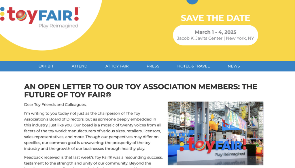 Nel comunicato stampa dichiarano che la prossima edizione della Toy Fair New York si svolgerà quindi dal 1 al 4 marzo 2025 sempre presso lo Jacob K. Javits Center di New York, ma stanno lavorando per ricollocarsi a febbraio nel 2026. Dicharano che sanno perfettamente di essere a ridosso della Spielwarenmesse di Norimberga, ma sperano comunque di riuscire ad accontentare tutti.