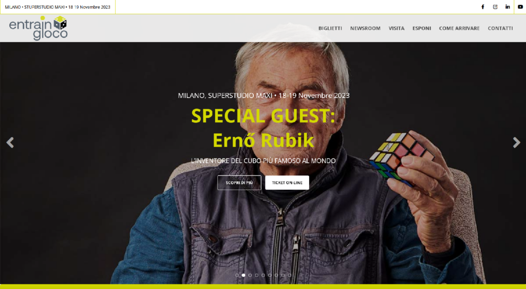 “Un weekend all’insegna dei giochi in scatola, di carte e di ruolo, puzzle e rompicapo compresi. Di ogni genere e grado, anche extra large. E con tanto di torneo di calcio balilla: chi vince porta a casa il biliardino. Tra gli ospiti più attesi Ernő Rubik, l’inventore del cubo più famoso al mondo. E poi l’alpinista Marco Confortola e l’attuale Campione del Mondo di Monopoly Nicolò Falcone. Sabato sarà la Notte del Gioco, una game night per giocare fino alle 23:00 con i giochi di oltre 30 editori.