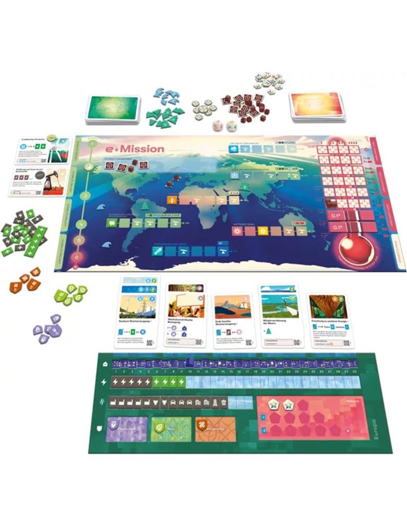 e-Mission è un cooperativo a tema climatico, dove i giocatori impersonano il controllo delle varie nazioni, cercando di bilanciare emissioni e produzione evitando il surriscaldamento globale, un tema quanto mai attuale.