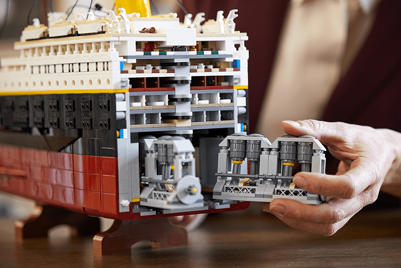 Oltre alle sue dimensioni esterne, il kit LEGO Titanic riproduce fedelmente anche diverse sale interne, come lo scalone di prima classe che si estende su sei ponti, il salone da pranzo in stile giacobino che si trovava sul ponte D della nave e la bellissima replica della sofisticata sala macchine.