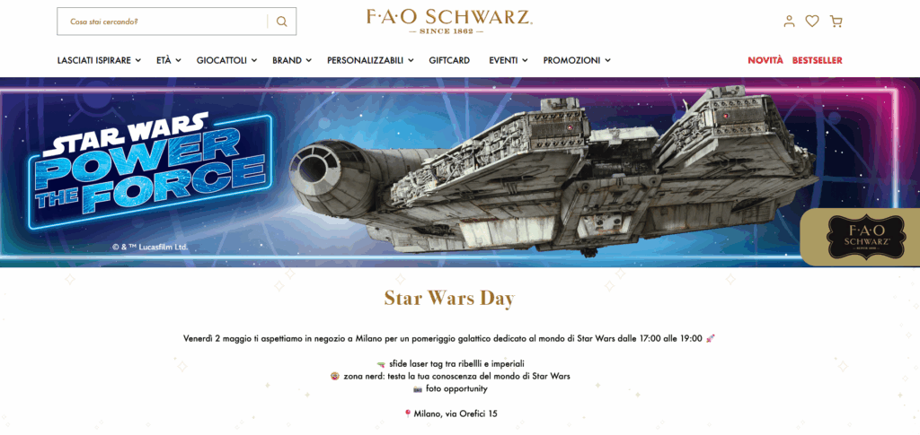 La celebre catena di giocattoli inizia i festeggiamenti a partire da venerdì 2 maggio, in particolare oltre a diverse offerte OnLine, invita tutti gli appassionati ad un pomeriggio galattico dedicato al mondo di Star Wars presso il negozio di Milano in Via Orefici 15 dalle 17:00 alle 19:00. Info alla pagina web Star Wars Day FAO Schwarz.